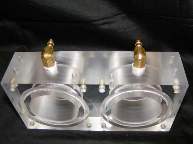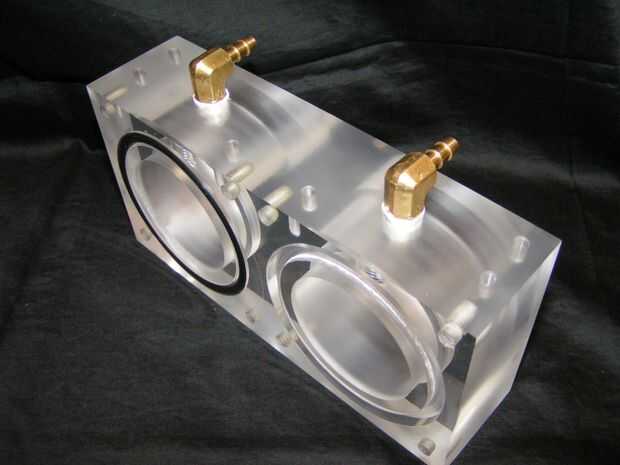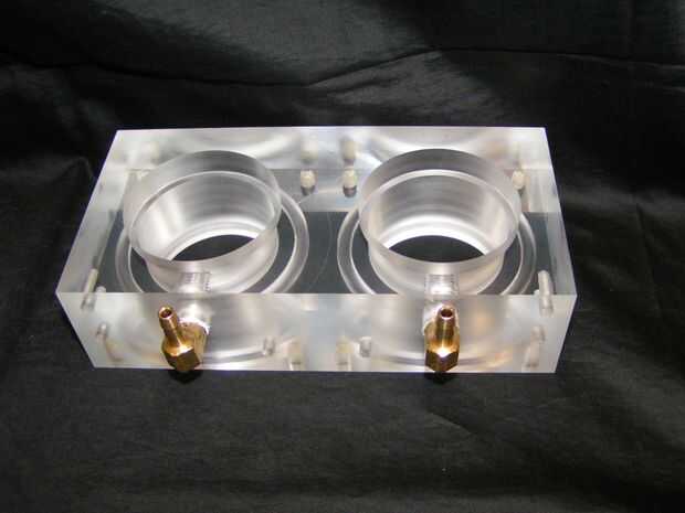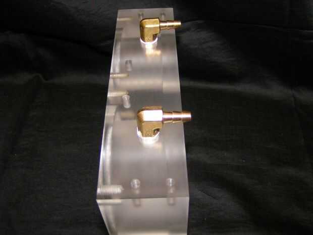 Como el bloque del anillo superior, esta parte tiene 2.25" a través del agujero con un cajeado de 2.5", así como las ranuras de junta tórica. Además, aunque tiene dos orificios de 1/4-18 para las guarniciones de cobre amarillo de ángulo recto, ocho agujeros de 1/4"-20 para montar el bloque de la tapa inferior y seis orificios de #10-32 a soportes de montaje Al canal.