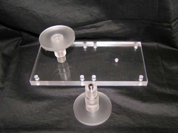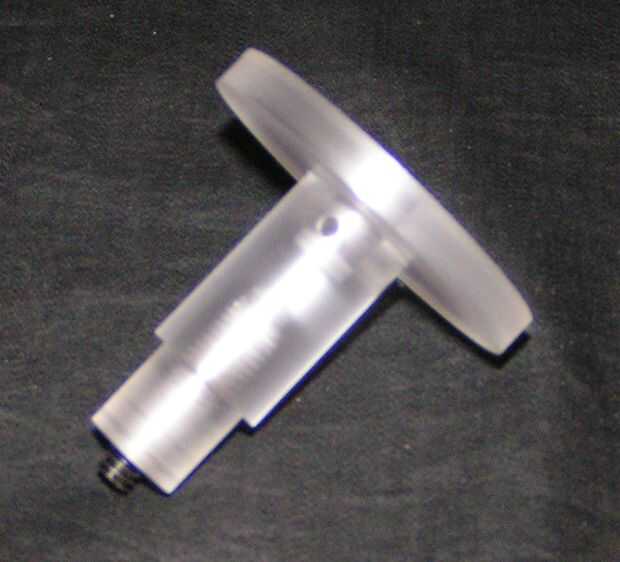 Bloque de tapa de la parte inferior también es similar al bloque de tapa excepto dos agujeros golpeado ligeramente inferior de 1/4"-20 para montar el objeto plataformas de aterrizaje. Los objetos de los dos tubos de vacío aterrizará en estas plataformas, justo por encima de la cara superior del bloque del anillo inferior. Sin las plataformas, tierra de los objetos fuera de la vista bajo el ángulo recto de latón. La plataforma diámetros exteriores son menores que el tubo de 2.25" de diámetro interior y se taladran a través de la tapa y los lados para permitir que el aire se bombea fuera de los tubos.