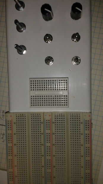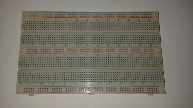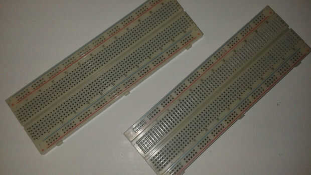 Usé dos tipos diferentes de breadboards para esta placas de 830 orificio proyectos matrimoniales y una versión del agujero de mini 170. Las placas de 830 orificio son donde va estar construyendo los circuitos. Quité uno de los carriles de la energía de uno de los tableros y ellos les espetó juntos. He despegado el adhesivo papel del forro y montar las tablas en el frente del panel del PVC. Simple.