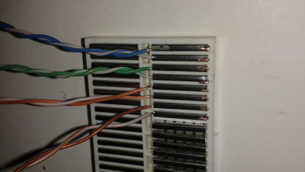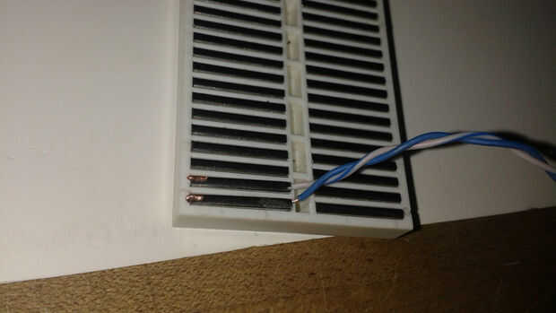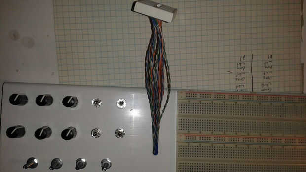 El tablero del 170 agujero es un poco más complicado. Esta tabla se utilizará para conectar los componentes del panel montado a los circuitos que se están construidos. Para ello, los conductores en el tablero fueron conectados a los componentes mediante cables. Primero quita la almohadilla adhesiva de la parte inferior de la Junta y limpiar con alcohol en un paño para eliminar cualquier residuo. Utilicé un alambre rígido para empujar los conductores salen de la tarjeta. He probado a soldar los cables en el pasado, pero la chapa brillante de los conductores evita la soldadura se adhiera bien. En cambio, descubierto 3/4" de un 8" pieza del alambre y doblar un anzuelo pequeño, apretado al final. Me deslicé el cable en el conector para que engancha el borde inferior y luego apreto el conductor en el tablero. He utilizado un par de pinzas para empujar y engarce que los conductores volver firmemente, creando un buen contacto eléctrico. Cuando los alambres fueron engarzados en su lugar, I había añadido tiras de cinta de dos caras a la parte inferior de la Junta, se deslizó los cables en la ranura en el panel y había montado en su lugar.