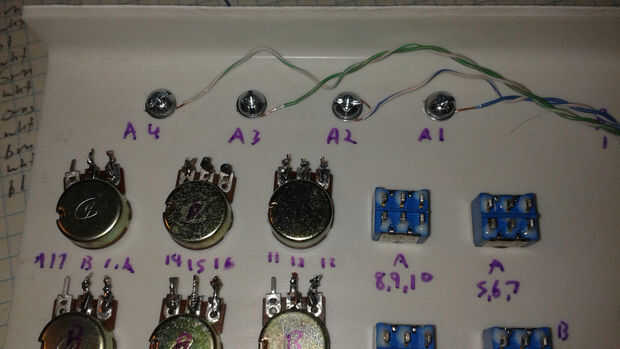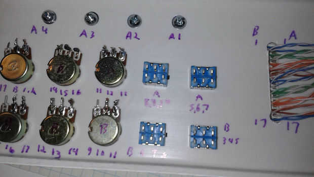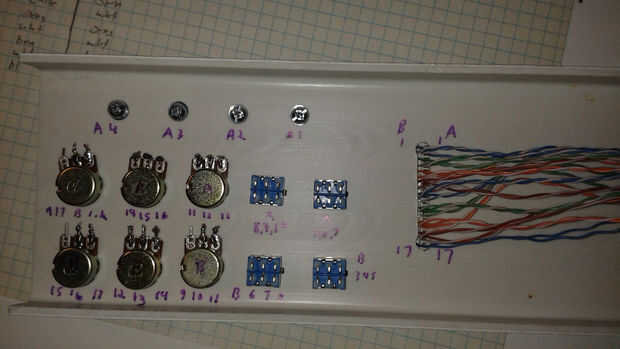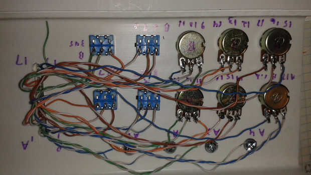 Era muy cuidadosa de los colores de los cables. Empecé con el conductor superior derecha (de la parte trasera) y soldadas al primer componente del panel, en este caso fue el primer post de tornillo. Procedí en orden, todos los cuatro mensajes de conexión. Después, conecté el primer switch, estos son doble polo, doble tiro, centro de interruptores de palanca, pero sólo ellos cableado interruptores como solos. Había soldado el alambre del conductor 5 en el primer estirón en el interruptor, el conductor 6 a la segunda oreja y el conductor 7 a la zapata del tercer y último. Continué de esta manera hasta que todos los interruptores y macetas fueron conectadas.