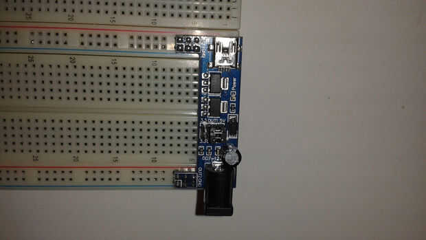 He instalado una fuente de alimentación regulada de 5/3v USB en el extremo de la placa para proporcionar energía. Puesto que los microcontroladores y chips CMOS que estará trabajando como 5v, esto es perfecto. Se puede utilizar cualquier fuente de alimentación que se adapte a tus necesidades-una verruga de la pared re-purposed, una batería o un conector USB funcionará igual de bien.