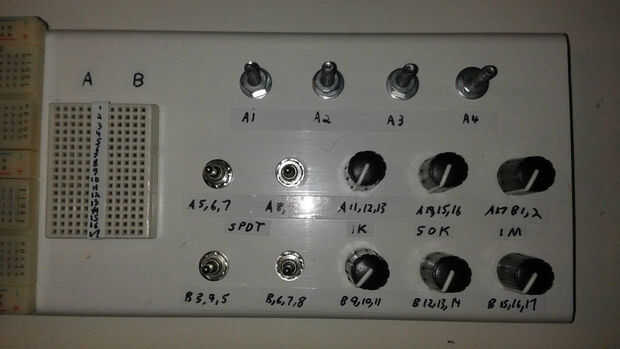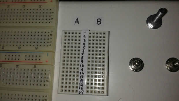 Usé algunos reciclados vinilo adhesivo y un marcador permanente fino-línea para hacer las etiquetas para el módulo de creación de prototipos. Marqué los lados del agujero 170 protoboard 'A' y 'B'. Hice una etiqueta para el centro del tablero y había etiquetado las filas 1-17. También hice las etiquetas para los componentes para identificarlos y tener en cuenta que filas en el protoboard cada uno conectado a.