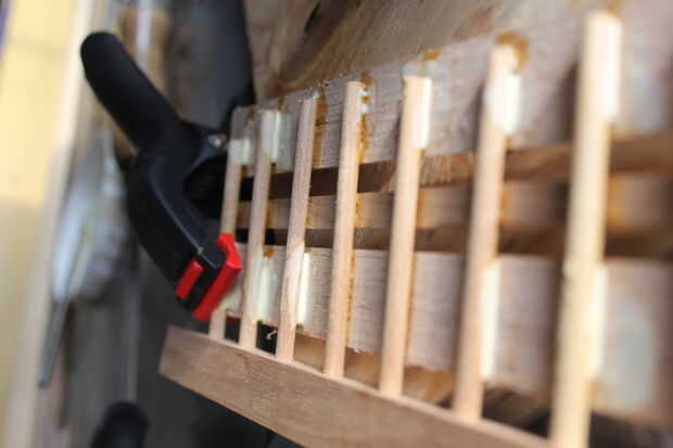 cortar 4 0, 75 * 0, 75 * 8 en son ala, corte orificios en el extremo también.