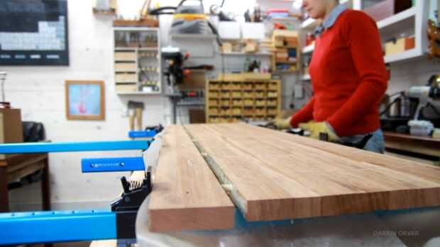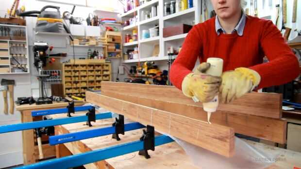 Y aquí están todas las tablas con agujeros perforados. Ahora me estoy preparando aquí pegar y sujetar este contador juntos, poner un papel encerado para que no pegue pegado y luego poner las espigas y pegamento. Cuando laminando varios consejos como este, siempre me gusta empotrar cada sección antes de pasar a la siguiente junta pegar. Y entonces simplemente enclavijar, pegado y fijación del contador juntos, un tablero en un momento. Y amo esa parte cuando se reúne la la última tabla.