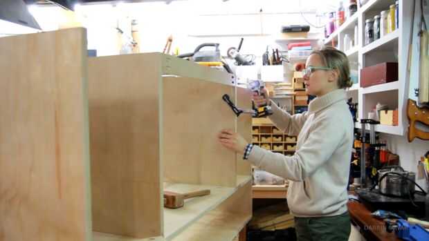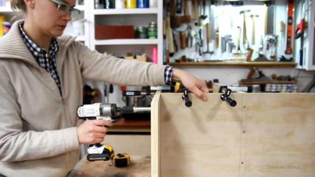 Así que empecé con poner juntos la base aquí y simplemente estoy usando pegamento y tornillos. Así que después de hacer mi marca, soy pre-perforación y avellanado y luego apriete la pieza en el lugar que realmente ayuda a la línea de todo hasta Plaza. Luego sólo continuar con el otro lado.