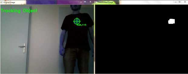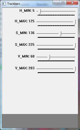 Puede seleccionar el color desplazando los controles deslizantes. No es RGB porque HSV distingue mucho mejor entre los colores. Es un poco difícil de usar si no sabes qué hacer, así que un simple manual. Abrir todas las líneas (min movimiento a izquierda) y max a derecha por lo que la pantalla es totalmente blanca. Luego deslice la barra superior 2 hasta que tenga el color que desee (no te preocupes el ruido todavía). A continuación usted puede filtrar el ruido arrastrando los 4 deslizadores restantes. El software es ahora el seguimiento de cualquier objeto en el color seleccionado.