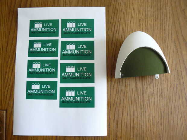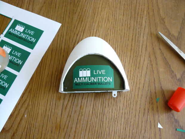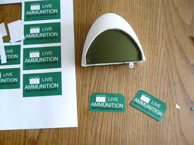 Imprimir la hoja de la etiqueta en un láser de color o una impresora de inyección de tinta y corte 2 de la izquierda más etiquetas de papel. Utilice adhesivo transparente para pegar las etiquetas en el lado. Luego usar parte de la pintura verde para mezclar la decoración con el resto de la pintura. En los cuadros la decoración parece demasiado brillante, pero en realidad el partido casi a la perfección. La cámara no captura como lo hace el ojo humano.