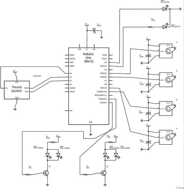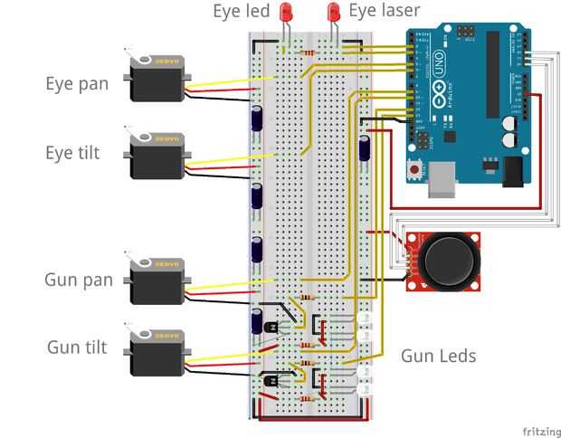 Todo fue hecho en un protoboard 1: porque no tengo tiempo para hacer un circuito y 2: porque después de que termine este proyecto no creo que se hacer mucho con la torreta. He incluido un esquema cualquiera puede repetir el resultado.