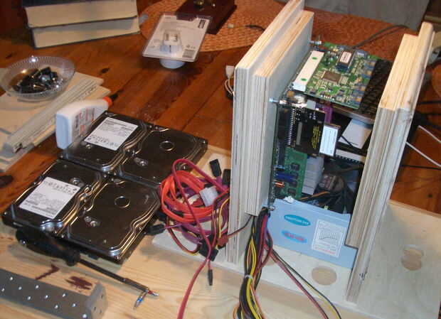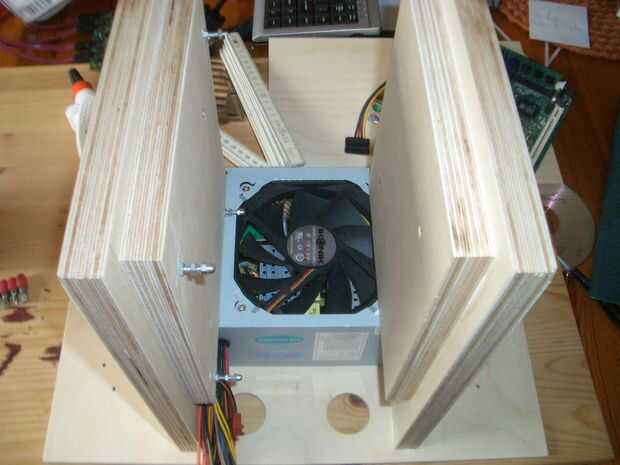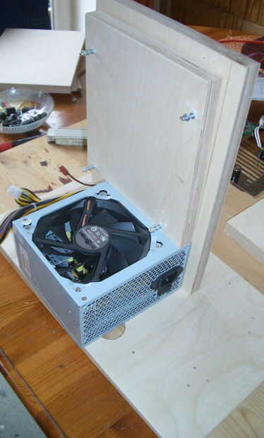 Que preparó una pieza de múltiplex como una placa base, perforé algunos agujeros para el montaje de la disk´s duro, el montaje de las paredes de la cajas y el cableado.