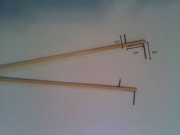 Doblar el alambre como se muestra.  Cuidadosamente empuje el alambre a través del spar ala en un punto de 3/4" desde un extremo.  Pegamento en su lugar con CA y reforzar la articulación envolviendo la capa de papel de tejido alrededor de la articulación y capa con CA.  Repita el proceso para spar ala 2da.
