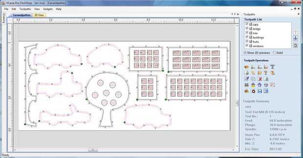 Usé 1/8 de pulgada para cortar todas las formas, como del árbol frutas, 1/16 del pedacito para cortar las ventanas de los edificios. Toma edades para cortar las ventanas, pero las esquinas son bastante precisos y hermosos. Sólo corté 0,08 pulgada de profundidad para las ventanas, para ahorrar tiempo, y también parecía mejor que recortes más profundos (la madera toda es 0,7 pulgadas).