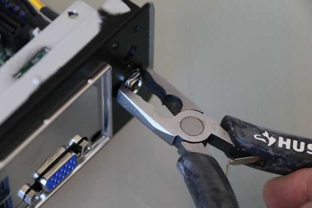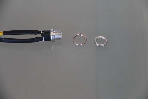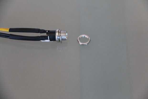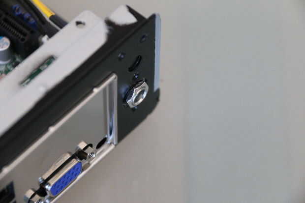 Ahora conectaremos el cable de alimentación de la placa base al caso. Quitar la tuerca del conector pero mantener la lavadora de split. Pase el cable con el conector desde el interior de la caja a través del agujero que se muestra y coloque la tuerca desde el exterior.