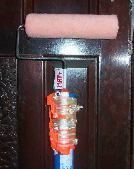 6. opcional: Utilice las bandas de goma para asegurar más el rodillo a la empuñadura, por bucle sobre el rodillo y hacia abajo en el mango. Asegúrese de que van entre las bridas.