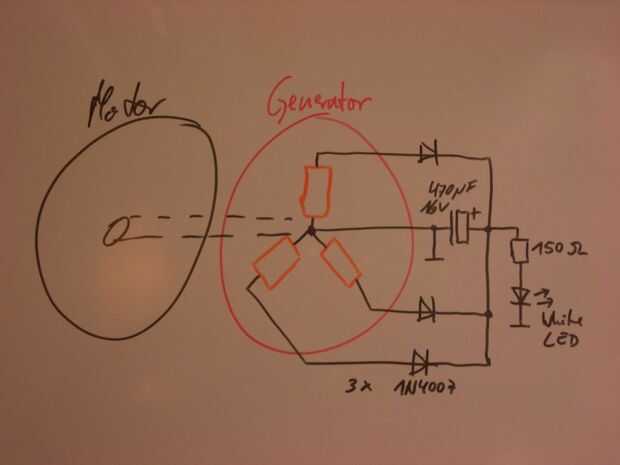 Partes de otro motor se pueden utilizar para construir un generador. Usar un motor sin escobillas dc que obtenemos tres fase actuales, vea http://en.wikipedia.org/wiki/Three-phase_electric_power . Las tres fases son rectificadas con tres diodos y la tensión resultante puede utilizarse para alimentar el circuito de pov.