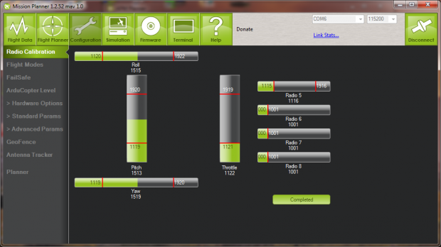 Una vez hecho esto, usted puede ahora configurar modos de vuelo para su controlador RC. Esto es donde realmente brilla APM. APM es un conjunto tan madurito de la tecnología, han realmente refinado sus algoritmos bastante. Debido a esto, son capaces de proveerle con modos de vuelo como estabilice, Loiter, vuelta a casa (o RTL), Acro, y así sucesivamente. Las más importantes a conocer son estabilice, regreso a casa y Acro. Estabilizar hace exactamente lo que probablemente crees que lo hace. Siga sus controles manuales, pero trate de estabilizarse como usted está volando. Recomiendo esto para cualquier principiante, y sorprenderá lo duro que es volar en su primer vuelo. Después de un rato, le parecerá fácil porque lo ha hecho antes, pero en principio, es sobrecogedor y estás asustado de que se caiga. Pensar como aprender a conducir un coche! Si han conducido por un tiempo, conducir se vuelve extremadamente fácil! Aún no pensamos en ello. Sin embargo, si piensas volver a cuando estaba aprendiendo, seguramente que puede recordar la aprehensión poco que tenía, mezclados con emoción, sentó en el asiento del conductor por primera vez. Regreso a casa simplemente tratará de volver a tomar-fuera posición y auto-land. Esta es una característica muy útil, pero es depende de su calibración. Más exactamente se calibrar mejor/más éxito esta función. Me resultó difícil perfectamente calibrar yo mismo, por lo que he encontrado la lista de parámetros del árbol y compensar manualmente algunos valores a mi gusto. Finalmente, es el modo Acro que es modo libre básicamente con el APM que solo sigue lo que dices. Este es el verdadero control manual. Esto será difícil de usar! Sin embargo, es una gran herramienta de depuración para ver exactamente que compensa están equivocados.