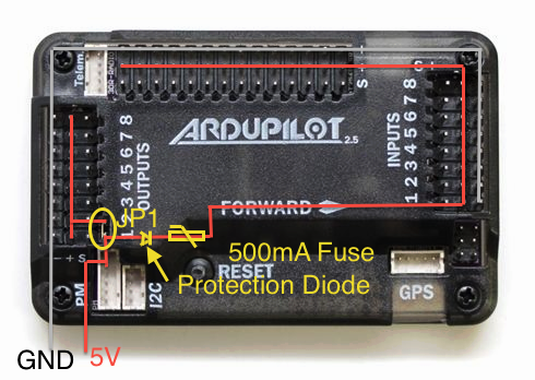 Desde allí, simplemente tienes que conectar cualquier entrada a las entradas APM utilizando un conector de servo hembra a hembra, y el transmisor será conseguir el poder. No se enciende, pero si que te has alineado hasta el cable correctamente en la entrada, conseguirá energía. Para confirmar que has hecho bien, asegúrese de que las líneas de señal ir a la línea de señal en el APM, el poder va a poder, y el suelo va a tierra. Corriente y tierra areusually indica el conector los cables rojos y negros respectivamente. Este es el circuito en el APM tomado directamente desde su página web.