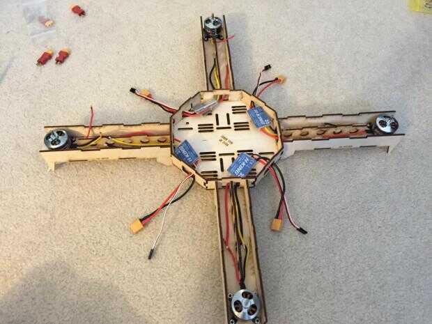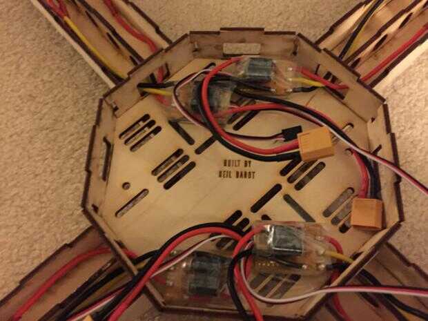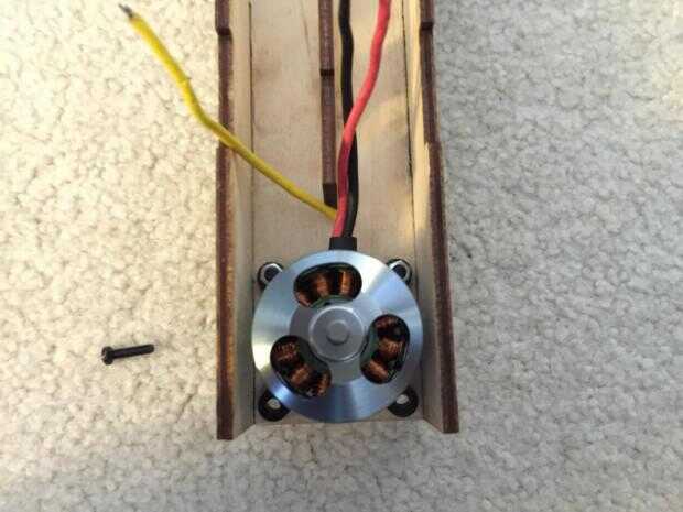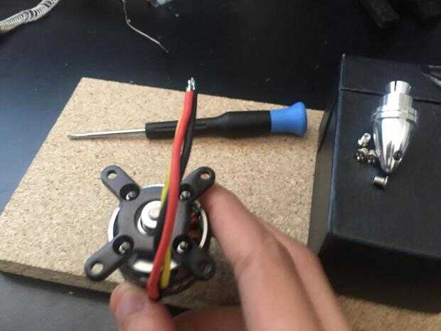 Una vez haya conectado los soportes del motor para cada motor, tienes que conectar el motor a la estructura. Uno de los errores que hice fue configurar mi motores con mi CES antes de montar en el chasis. Después de configurar todo, me di cuenta que simplemente no caben el motor a los cables de salida a través de sus ranuras previstos sin deshacerlos. A continuación muestra el error que cometido. De manera similar a mi error de conjunto de la estructura, no deben hacer alguno de estos pasos. Estos es simplemente mostrar el error que hice para no repetirla.