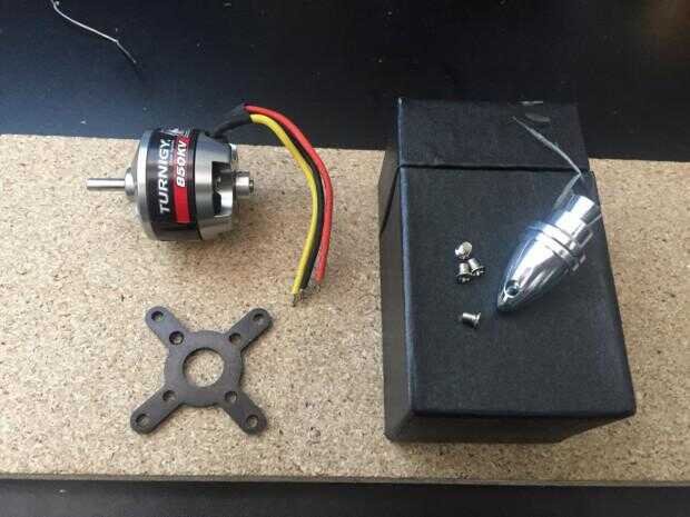El primer paso es sacar todas las piezas y asegúrese de que tener el motor, el Monte, cuatro tornillos de montaje del motor y un adaptador de hélice.