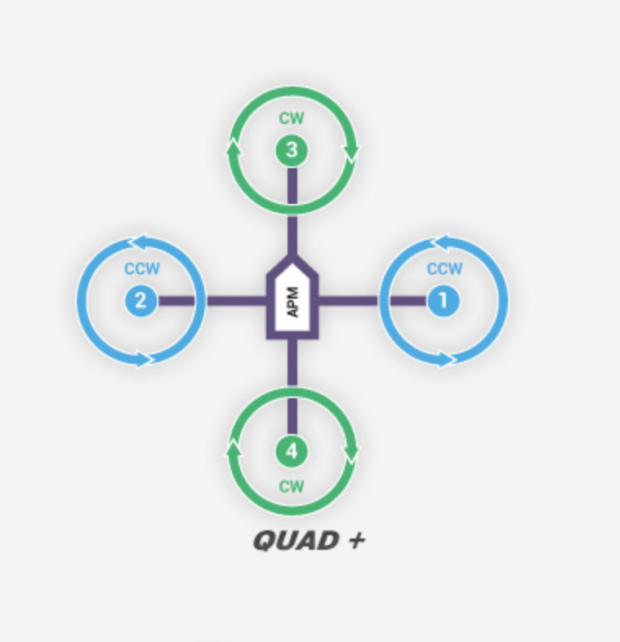 Para hacer el quadcopter operan correctamente, dos de sus motores tienen que girar en sentido horario, y dos tienen que girar en la dirección contraria. Yo estoy usando el Quad + diseño, para que extienda mi motor tendrá el siguiente aspecto: