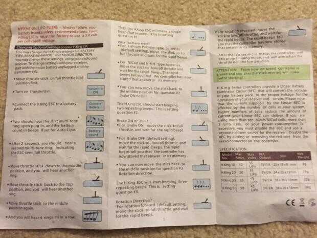 A partir de ahí, tienes que programar con el manual de la ESC. Esto cambia mucho, pero implicará escuchando pitidos y mover la palanca para mover esencialmente a través de un menú. Las siguientes son las instrucciones de los CES de HobbyKing he utilizado: