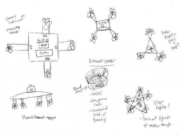 A partir de ahí, hice unos bocetos rápidos de algunos diseños que consideré para mi quadcopter. A continuación es un ejemplo de uno de mis bocetos.