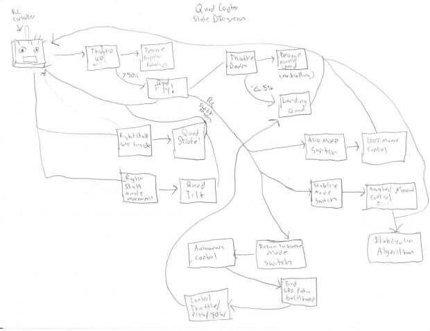 Comencé mi proceso de diseño pensando en las diferentes acciones básicas que necesitaría mi quadcopter que hacer. Yo pensé en ellas como Estados y vino para arriba con el siguiente diagrama: