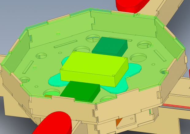 Lo que parece ser la idea general que tenía en mi cabeza era que necesitaba tener cuatro propulsores equidistantes con un lugar para montar el motor y una consola central donde pude poner mi electrónica y cableado. Dando un paso detrás de la mesa de dibujo, he intentado mirar el diseño desde un sentido más práctico. ¿Cómo sería mejor obtener esto funcione? ¿Cómo encajaría todo? Quadcopters vuelo alrededor y son propenso a estrellarse, ¿cómo puedo mantener mi electrónica segura? Me fui en pensar un diseño donde tuve 4 incluido armas, con una consola central cuadrado. Sin embargo, me di cuenta que estaba tratando de burlarse hasta que los brazos tendría que ser muy largo para dar digno espacio entre cada hélice y la consola central. Me mudé de una plaza a una forma octagonal más, como que me daría la longitud en lugares donde lo necesitaba (particularmente para la batería) mientras que teniendo una estructura curva que corta las aristas de un prisma rectangular potencialmente innecesariamente grande, mientras que todavía siendo cortado láser. Me di cuenta de que si divide la pieza octogonal en dos capas, ahorrar espacio y madera (así tenga menos peso total).