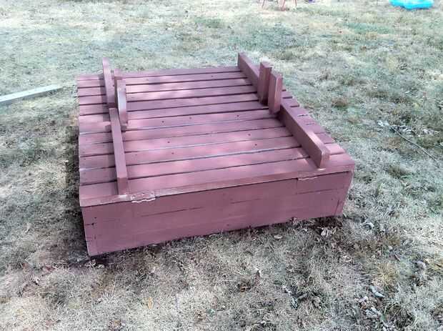 Arenero madera con tapa y bancos.Hechas de tablas de 2,5 cm x 15 cmSandbox final dimensiones 135 x 135 cm x15cmPara lo que se necesita: placas, tornillos, 8 con bisagras.Conjunto de herramientas mínimas: Sierra, destornillador