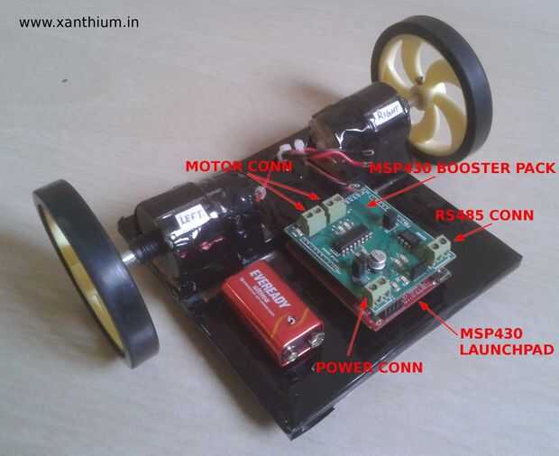 La inteligencia para el Robot es proporcionada por un microcontrolador MSP430G2553 (Launchpad) mientras que los motores son controlados por un Chip de Control de Motor L293D (Booster Pack).
