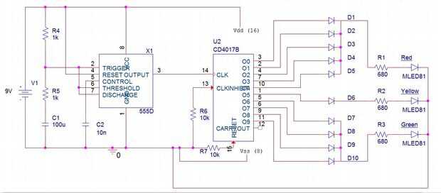 Una vez que el astable construido y comprobado para funcionar correctamente, entonces puede Agregar el contador 4017 y los LEDs a tu circuito.