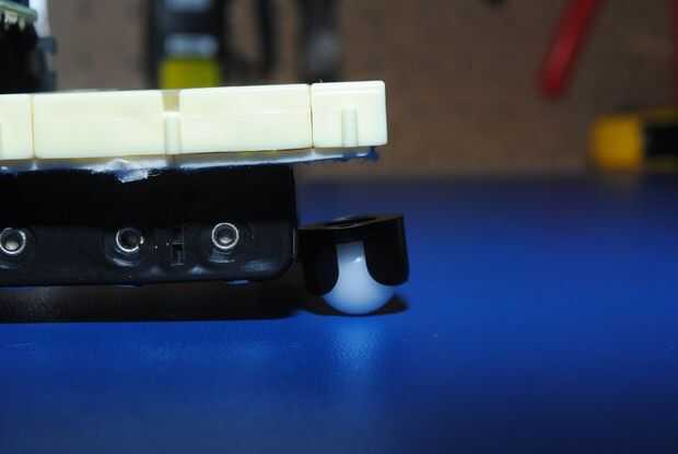 Tomar las ruedas y les Presione firmemente sobre los servos. Las ruedas encajan muy bien, por lo que toma mucha fuerza para conseguir! El último paso en el proceso de montaje es poner una rueda en la parte frontal del robot. Como se puede ver en la imagen, la rueda es aproximadamente 1/4" de demasiado corto, así que tenemos que encontrar algo para poner entre él y el protoboard. Con restos de madera y cinta, construir un espaciador para aumentar la separación de la rueda. Una vez que el separador es el tamaño correcto, utilice cinta de doble cara y fijar la placa y el espaciador, el espaciador de la rueda.