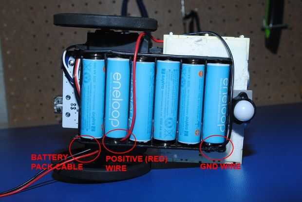 Los servos no deben ser alimentados mediante el pin de 5V de Arduino porque puede dibujar más actual y luego el Arduino puede proporcionar. La forma correcta es alimentar los servos directamente en una batería (o la misma batería alimentar el Arduino o, mejor aún, un paquete de baterías separado). Cuatro pilas AA le suministrará los motores con en alguna parte entre 4.8V y 6V dependiendo del tipo de batería, que lo que nuestros servos. La forma más sencilla que he encontrado para hacer esto es meter un cable rojo en el segundo resorte desde la izquierda y un cable negro en la pasada primavera a la derecha en la batería. Nota: Preste especial atención a la orientación de la batería en la imagen de arriba. Asegúrese de que cuando se pone el cable rojo en la "segunda primavera de izquierda" que de la batería cable esté en la parte inferior izquierda. Si tienes un multímetro, este sería un buen momento para utilizarlo para verificar que es conectar los cables a los lugares correctos.