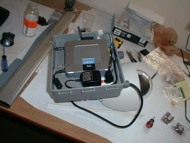 Pegar el dispositivo móvil en el router, conecte el cable Ethernet de la cámara en el router, conecte el ventilador usb en el router y conecte el cable de alimentación en el router. Conecte la cámara y el router en el GFCI, luego enchufe el cable de alimentación de una fuente de energía. Después de varios segundos el sistema debe estar en ejecución.