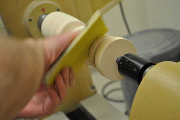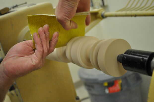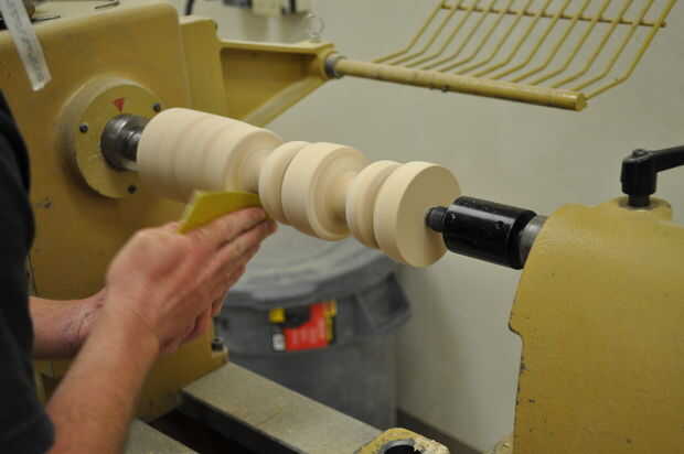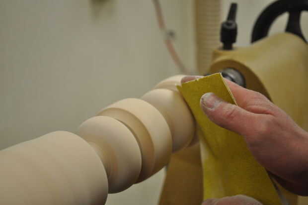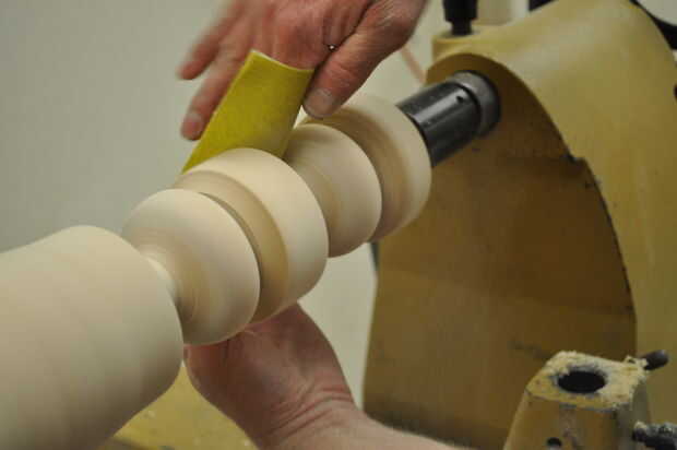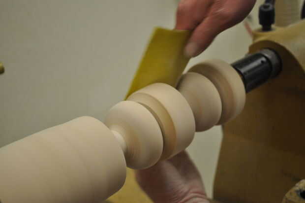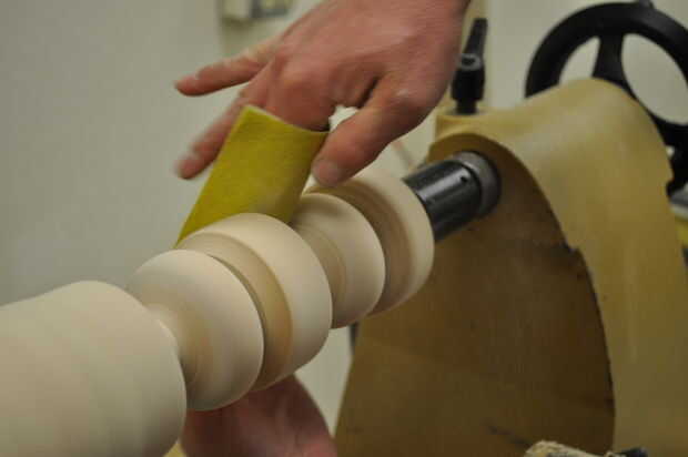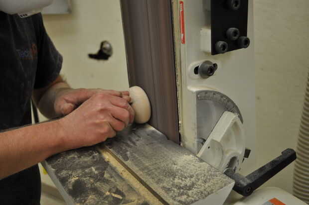 Después de terminar con el grano 220, parte de las asas con un escoplo y una sierra de corte transversal. Una vez que se quitan las asas de la acción principal, la parte superior de la arena y fondos lisos usando una lijadora de banda.