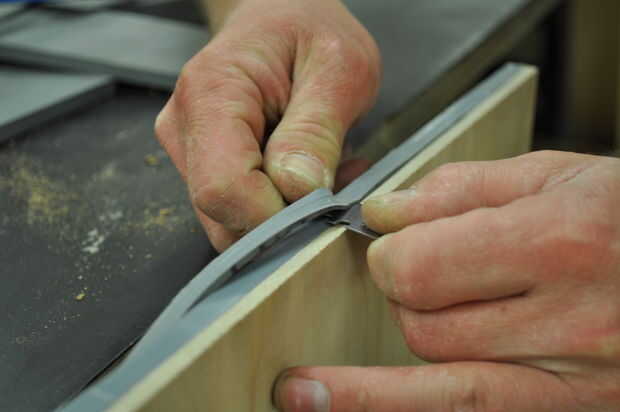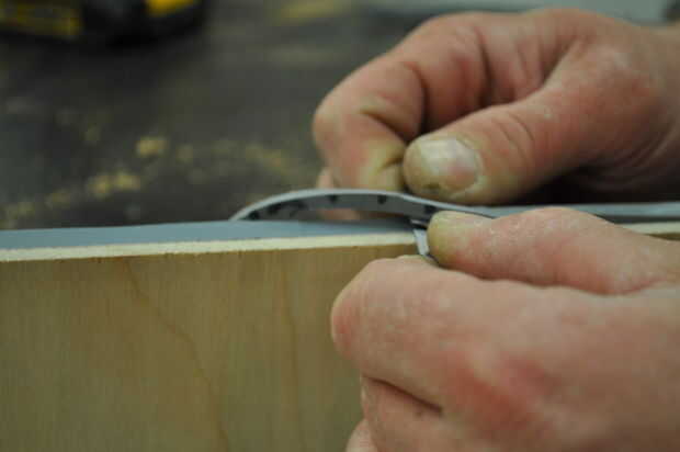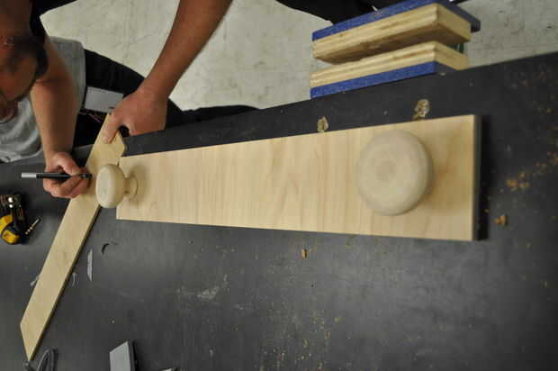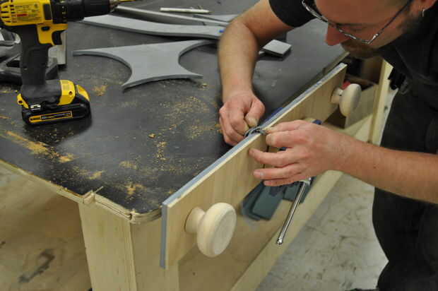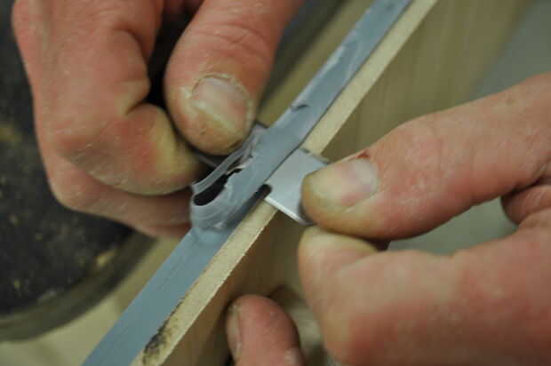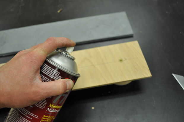 Cortar la goma con una hoja de afeitar; Asegúrese de que es ligeramente más grande que el tamaño de la madera contrachapada. Adhesivo en aerosol se aplica a la madera contrachapada y presione firmemente la goma a la madera. Permiten el adhesivo durante unos minutos. La Junta de la abrazadera en un tornillo de banco y utilice la cuchilla para recortar los bordes de la goma a ras con la madera contrachapada.