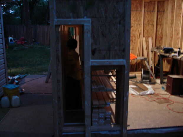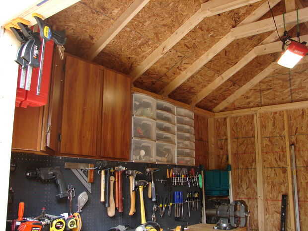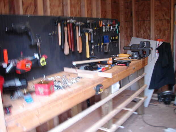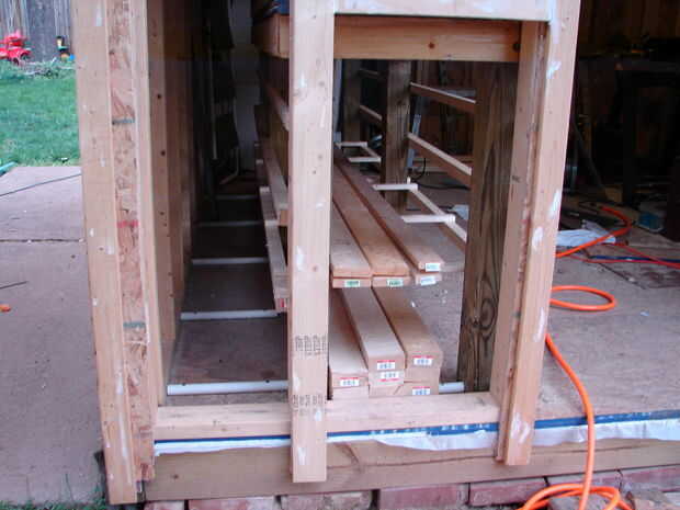 Esto es donde empecé a pensar en cómo iba a guardar todos mi madera. Yo había planeado en la construcción de una pared rack, similar a lo que yo había utilizado en mi garaje de coche. Pero odiaba usar encima de una pared entera para el almacenamiento de madera. También sabía por experiencia que sería quedar cosas contra él y pronto estar cavando madera y chatarra de mi camino. Decidí usar el espacio debajo de mi mesa de trabajo para almacenar las tablas largas y me di cuenta que sacando mi banco de la pared pude deslizar productos plancha detrás de él. Esto creó un problema: Cómo lo consigo hacia fuera. La tienda no es tiempo suficiente para sacar tablas de 8 pies de dentro y probablemente tendría que moverse las cosas para llegar a ella de todos modos. Así que mi plan para este vino de un momento de Epifanía repentina, cuando decidí cortar las puertas de acceso en la parte delantera y construir mi almacenamiento en mi área de trabajo tipo. Esta ha sido la mejor idea única que ha salido de mi taller. No puedo expresar suficientemente lo fácil que es para que poder llegar directamente a un tablero que necesito con sin problemas. Sólo retirar las puertas y sacar lo que necesito. Puedo almacenar una sorprendente cantidad de madera en esta zona. Tengo una zona secundaria para algunas mercancías de la hoja de corte y un depósito de chatarra al lado de mi sierra de mesa en el garaje. Pero esta área almacena la mayor parte de mi madera.