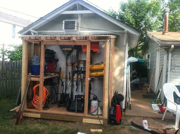 Más tarde agregué dos armarios de 2 x 4 pequeños en los lados izquierdo y derecho de la caseta. Uso uno para almacenar camping y artes de pesca, el que será pronto re propósito para equipo de deportes de mis hijos. Prefería la idea de múltiples pequeños galpones / closets porque no quería enterrar todo en un cobertizo grande.