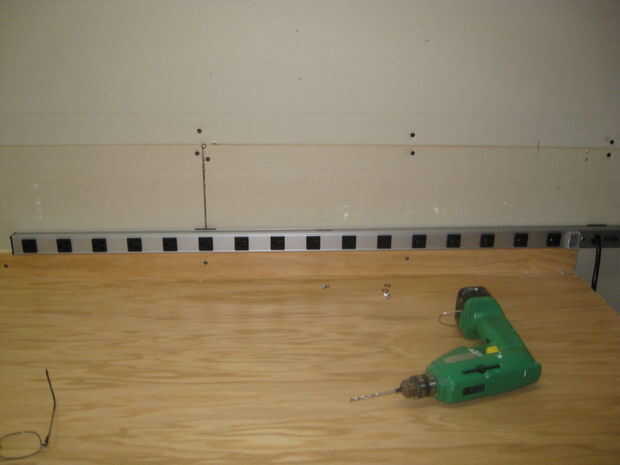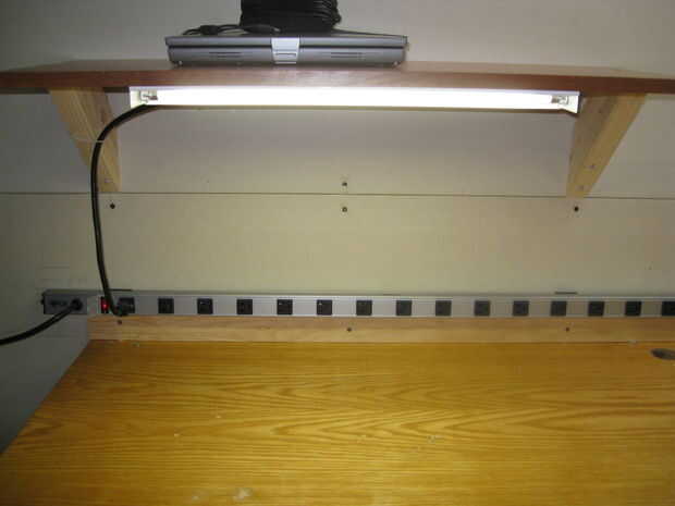 Encima de esta madera montamos una tira de 4 pies de salida en cada extremo - la separación vertical de la superficie hace fácil de entender tapones cuando se inserta o quitarlas. Cada tira viene con un clip de resorte de metal que se atornilla a un poste y luego recibe la Faja de salida con un "clic" discernible. Porque las tiras vienen con 15 pies de cable, acortó a uno con un enchufe del mercado de accesorios que tenía de un proyecto anterior antes de enchufarlo a una toma de corriente cerca del tanque de la aspiradora. El otro cable que dejamos largo, enchufándolo a una toma de corriente debajo del Banco (en un circuito diferente de la primera tira) y recoger el exceso de longitud con un cable de atan.