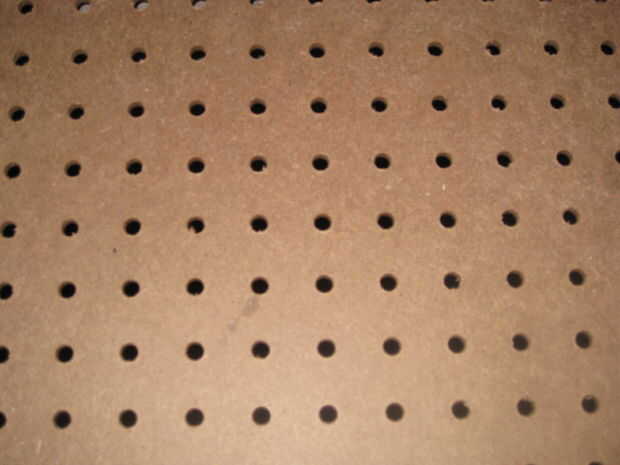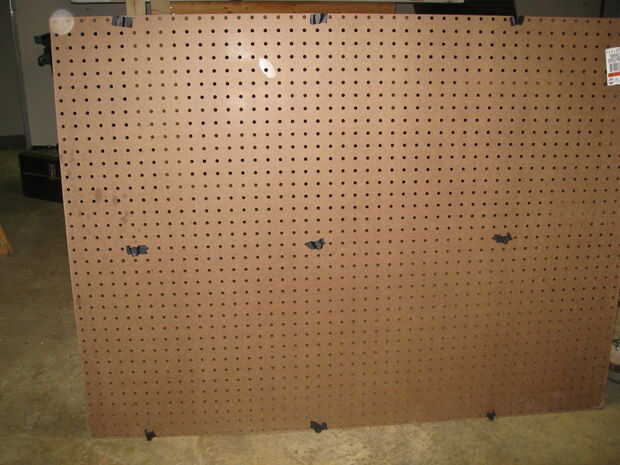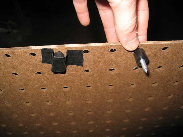 Pegboard ya se haber cortado a la medida, tenemos que colocar pequeños espaciadores de plástico como las mangas en los tornillos entre la parte posterior de la placa y la pared; Esto le da espacio para el pegboard ganchos ser insertado. Utilizamos negro cinta de artes gráficas para asegurar los separadores en la parte posterior de la Junta (en lugar de enmascarar cinta azul, que era definitivamente visible desde el frente), entonces condujo los tornillos brillantes (proporcionados en el kit de surtido de pegboard gancho con los separadores) en los pernos prisioneros que habíamos marcado previamente. En el segundo perforado en el lado opuesto de la habitación, usamos negro 2" tornillos y se veían mucho mejor.