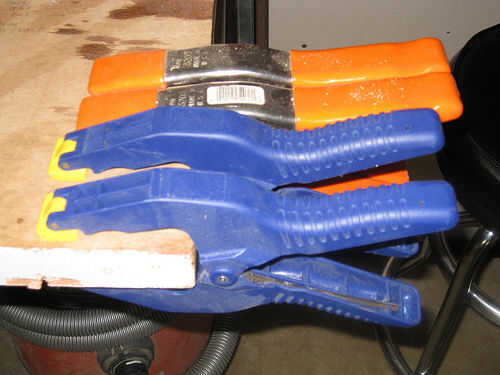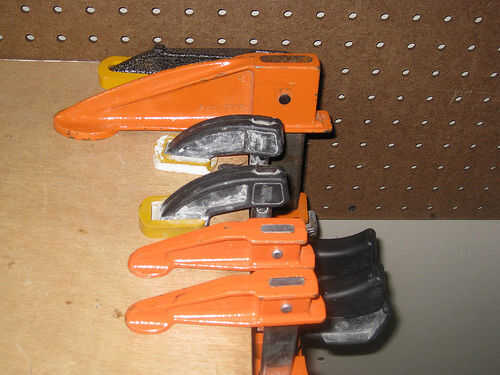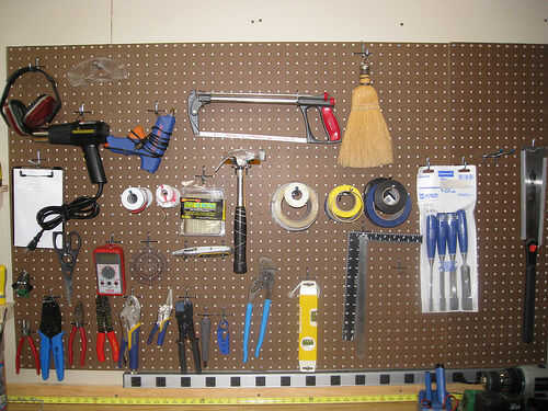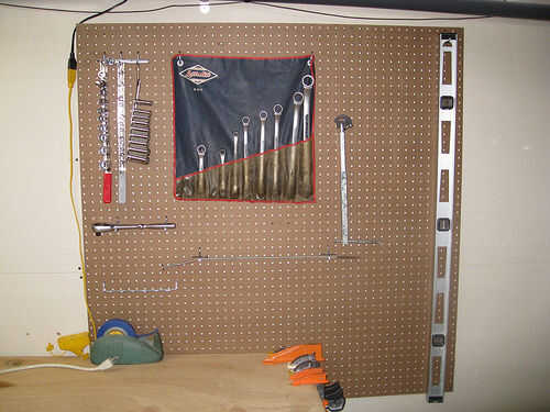 A través de la sala de 4'x 4' pegboard, montamos el nivel largo, llaves de boca y zócalos en tiras de resorte. Abrazaderas (llamadas maravillosamente "calambres" en el Reino Unido y Australia) fueron en cajones o en el extremo corto sin usar del antiguo Banco de trabajo.
