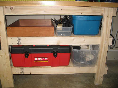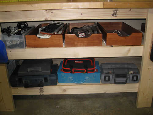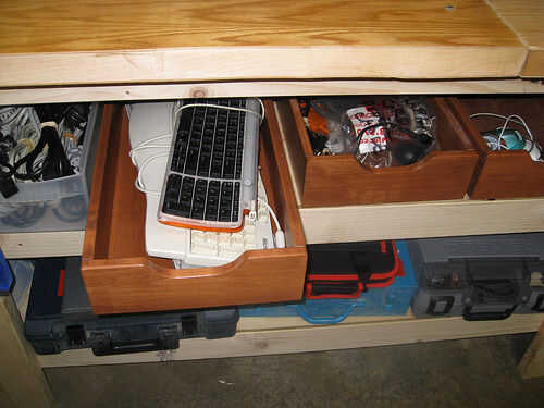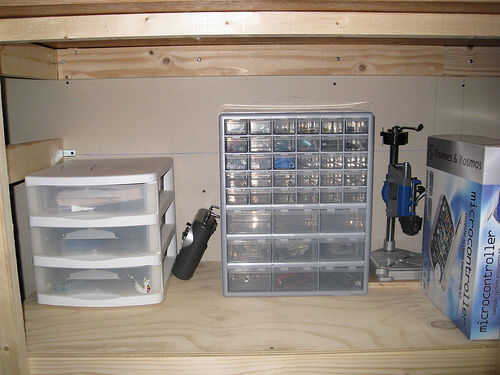 Intentamos predecir qué herramientas y suministros se utilizará más a menudo en el sótano. Como resultado, la sierra circular me alojé en el garaje con los otros generadores aserrín, pero la herramienta Dremel, taladro eléctrico y rompecabezas se encuentran en el sótano. El rescatado las cajoneras (ver arriba a la izquierda, más abajo) intencionalmente quedan vacías parcialmente proyectos terminados pueden ser almacenados, (al garaje de pintura pulverizada por ejemplo), o separados de los otros ocupantes del espacio de trabajo. Claro, o casi-claro, contenedores de piezas hacen simple ver que tenemos un montón de verrugas en el cuadro central superior de la pared. Colores distintivos, por otra parte, son también ayudas de memoria: teal es para interconexiones de audio y relacionados con el hardware.