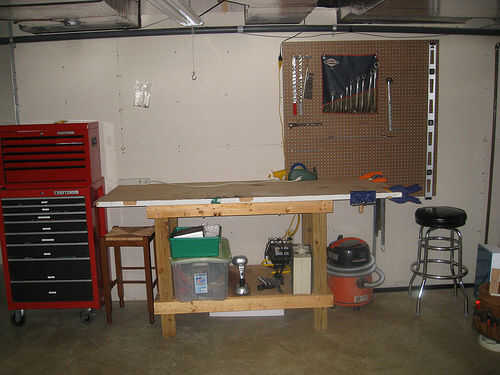 El antiguo Banco de trabajo, también construido con una puerta de fuego, ahora se limpia apagado y listo para proyectos. Es en la pared opuesta del nuevo banco de 12 pies. Contamos con sala para estantes altos si decidimos instalarlos, pero la plataforma baja actualmente tiene alambre y cable, clasificados viejos tornillos y hardware y las partes vacío de tienda. En el pecho de herramienta del artesano nos almacenar pedacitos de taladro, equipo de seguridad, de electricista y de fontanero herramientas y llaves.