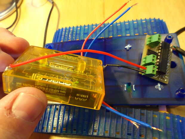 Tira de los extremos de los alambres como se muestra.  Atornillar los cables a los bloques de conector de tornillo verde en el EMGRobotics Audio Dual Motor regulador Junta (ADMCB) como se muestra.  Asegúrese de tener en cuenta el color del cable que va en cada lado de cada bloque.