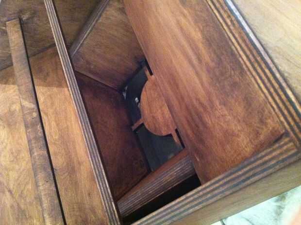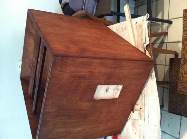 Hemos decidido poner las manijas de la manera difícil, Yaaay! Usamos un router para agujerear hacia fuera de las cavidades de la manija en lugar de corte a través de todo el camino con la sierra caladora. Esto tenía algunas ventajas y desventajas. Ventaja: Crea un recinto hermético más. Desventaja: El router se gira a 23.000 rpm. La vibración que emana de la cabina creó una oreja piercing suena a cerca de 140 db. Utilice protección para los oídos! Después de que fue hecho se procedió a la cabina de la mancha. Utilizamos en General acabados de Gel de la mancha.