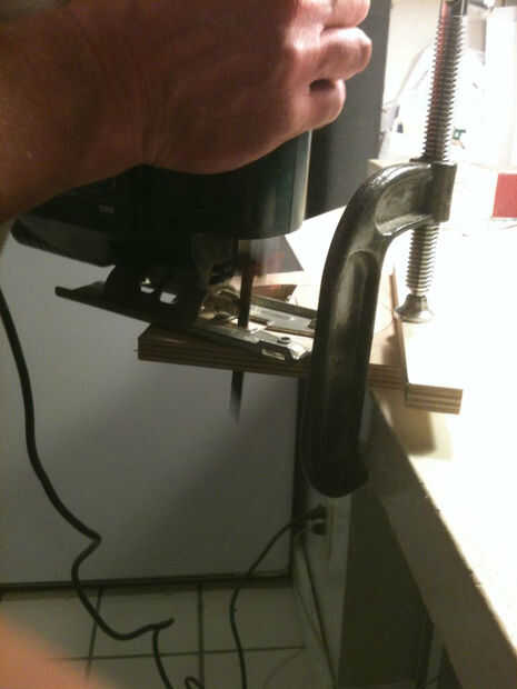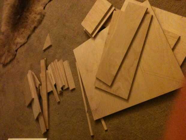Esto fue un paso más bien tedioso, simple pero difícil. Utiliza la Sierra de mesa para cortar la madera contrachapada a la medida. Madera contrachapada de marcado para todos los puntos de pegamento y las conexiones. Cortamos el centro de los frenillos del cuerno hacia fuera, son los llamados "agujeros de relámpago" para hacer la cabina más ligera. La parte más difícil de esta marca la madera, queríamos conseguir que coincidan con los planes.