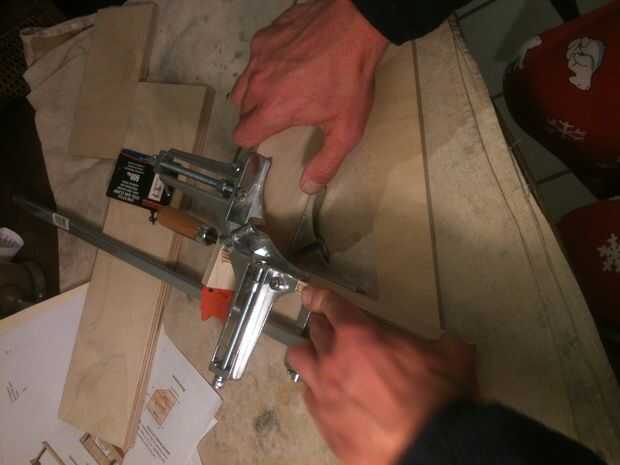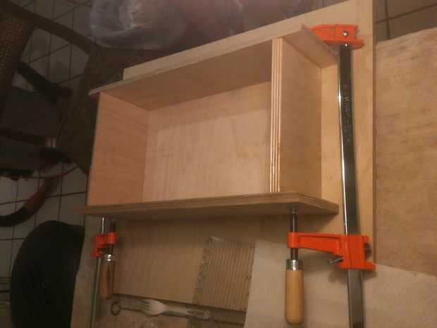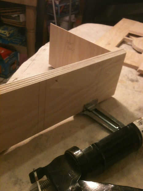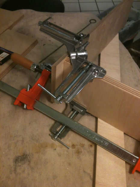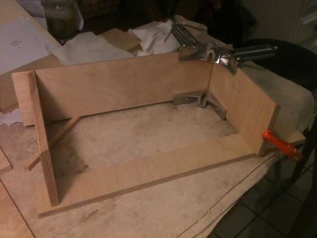 Con abrazaderas de ángulo recto para mantener la Plaza de las esquinas que sujeta y pegado el conducto creando un abierto terminó la caja de madera. Intentamos hacer esto posible cuadrados utilizando pinzas en lugar de tornillos. El pegamento que se expande como cura para crear un recinto hermético. Esto es muy importante o bien el altavoz no suena tan bien como podría. Después de que ha curado usted instalar el conducto a la caja acústica. Una vez que haya curado entonces instalar las llaves del lado de la cabina en la la Asamblea deflector/conductos. T