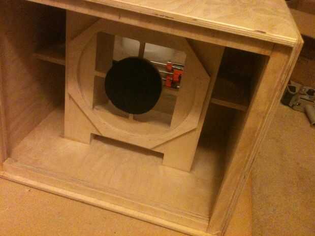 Este paso también fue fácil. Haciendo la fase del enchufe. Las instrucciones dicen usar espuma de madera o de alta densidad. Decidimos hacer la fase enchufe espuma porque terminaría siendo un poco más ligero. Cortar poco de espuma y luego pintado negro para confundirse con el controlador instalado. Para el separador driver, era tipo de disco duro. Decidimos usar un compás para hacer el círculo del tamaño correcto y procedió a cortar con la sierra caladora. El marco de la caja posterior no era muy difícil. Sólo había que unir rayas madera y luego montar las bandas pegadas dentro de la cabina. Se utiliza para sujetar la espalda en.