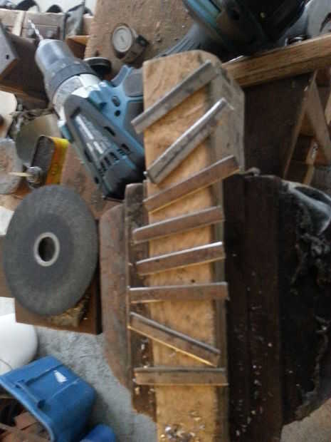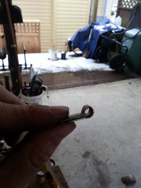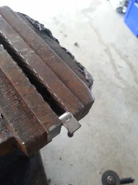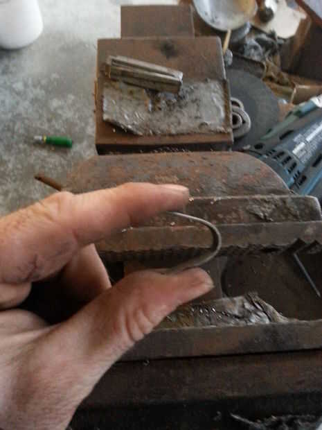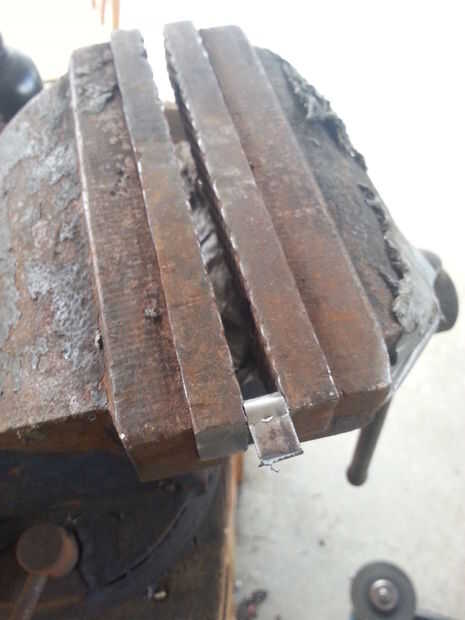 Corté unas tiras de acero de calibre 18 de 2" de largo y 5/16" ancho. Había doblada por la mitad alrededor de un clavo y martillo que clava de mi para cerrar hasta las uñas. A continuación sujeta en mi vice, limpiar un poco los rollos y que eran para hacer un lado plano que todos compensar un poco.