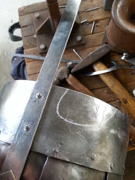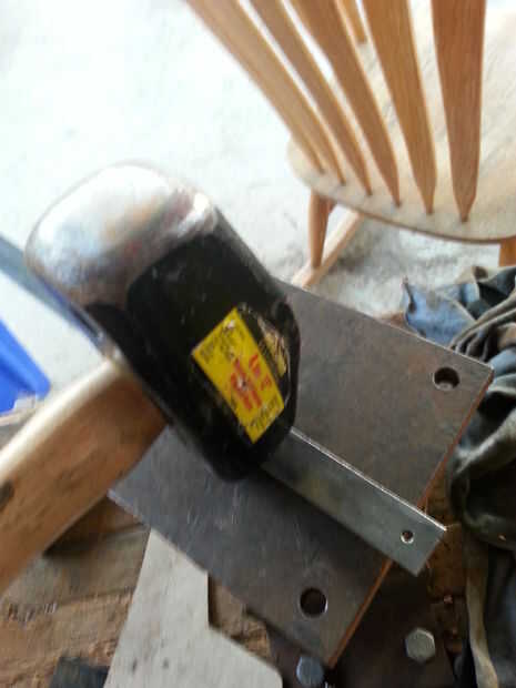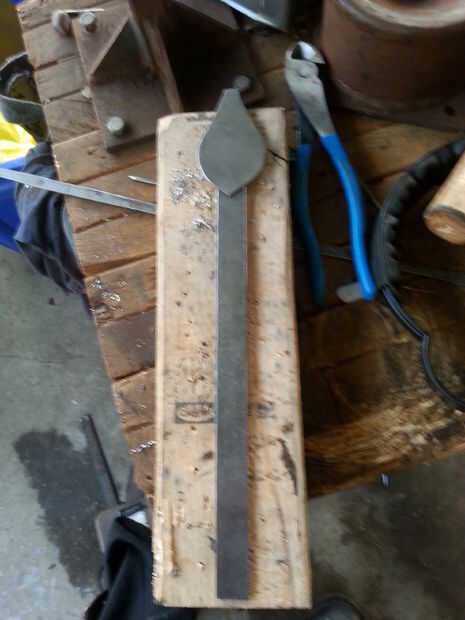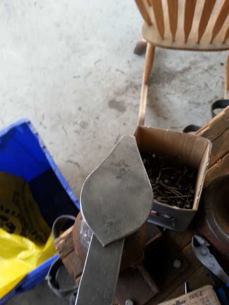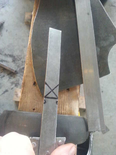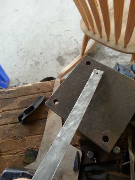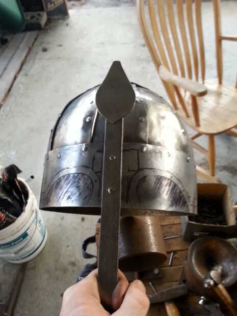 La nasal funciona abajo de la línea central de la cara, por lo que parecía un buen lugar para empezar en. Originalmente había planeado utilizar una barra de 1" para hacer de, pero después de permitir que el ancho de la moldura en los orificios de ojos parecía que sería un poco demasiado ancha. En su lugar usé una barra de 3/4". La acción había venía con algunos muy máquina como marca de rodillo en él de cuando fue hecha. Para deshacerse de ellas solía mi trineo martillo contra un bloque diferente de acero. Esto funcionó por aplanar hacia fuera las marcas de rodillo y estampar cualquier imperfección en el bloque de acero en el bar. El resultado final era algo que parecía mucho más a mano.